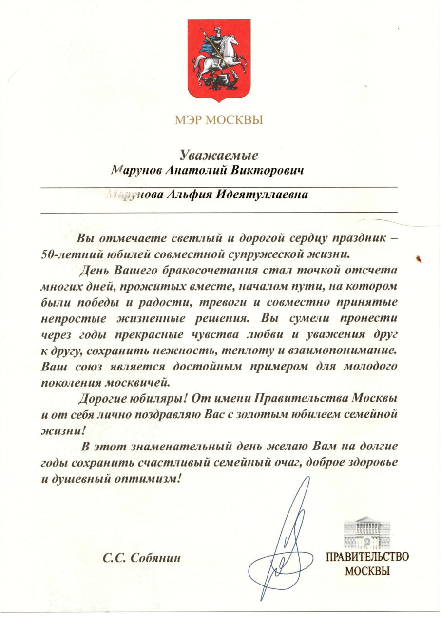 От имени мэры Москвы Сергея Собянина поздравление с 50-летним юбилеем бракосочетания получила семья москвичей Маруновых.
