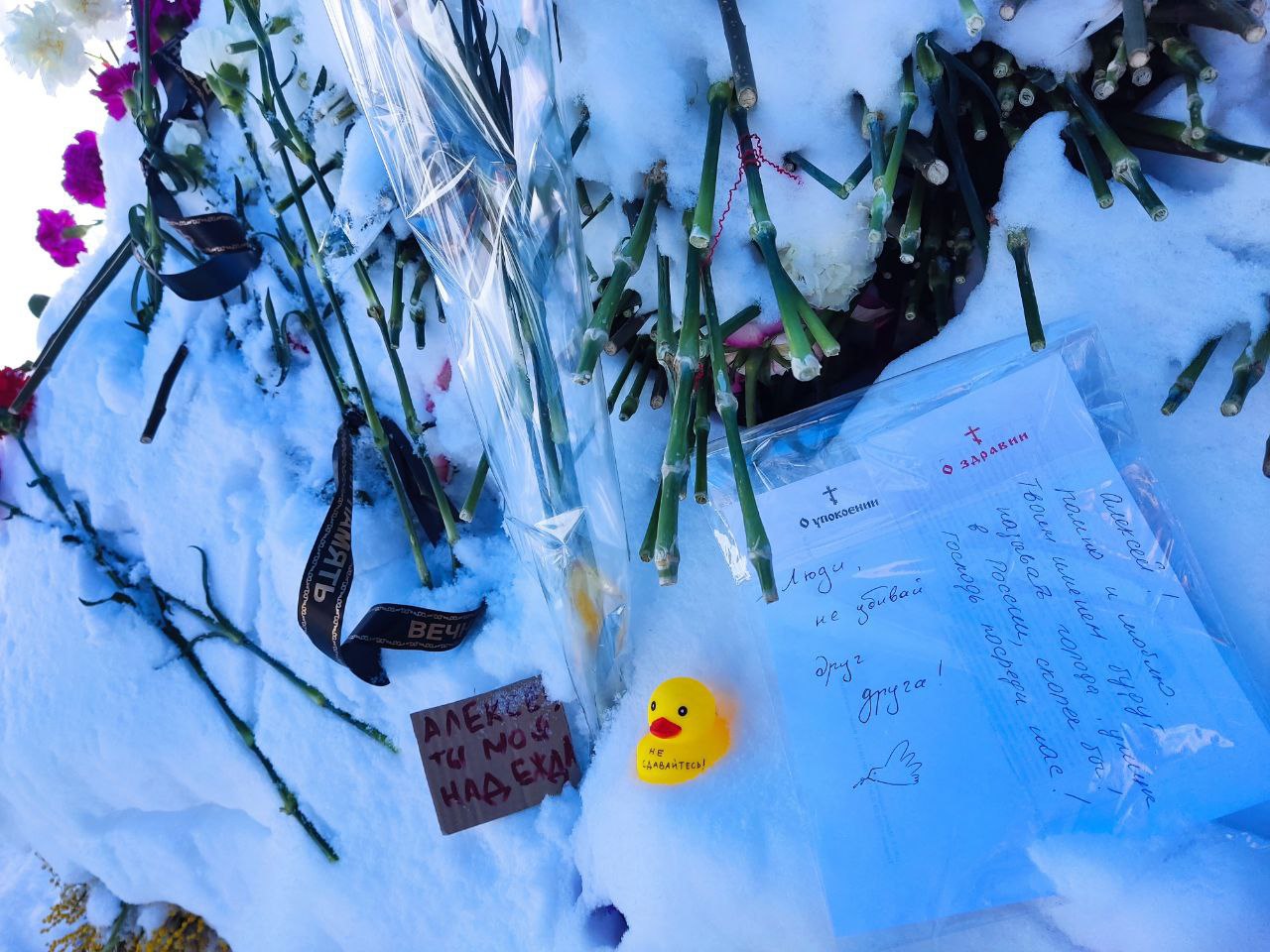 На церковных листочках «о упокоении» и «о здравии» — не только имена, но и реплики, которые режут прямо в нерв: «Люди, не убивайте друг друга!» (надпись из Сандормоха), «Алексей! Помню и люблю… Твоим именем будут называть города, улицы в России, скорее бы! Господь посреди нас!». Рядом — жёлтая уточка с «Не сдавайтесь!», записка «Алексей, ты моя надежда», траурная лента «Вечная память», значок “Нope” (“Надежда”), венок с лентой «Спасибо!» и открытка «Новомученик» — собирательный образ невинно осуждённого и казнённого, которого потом прославили как святого.