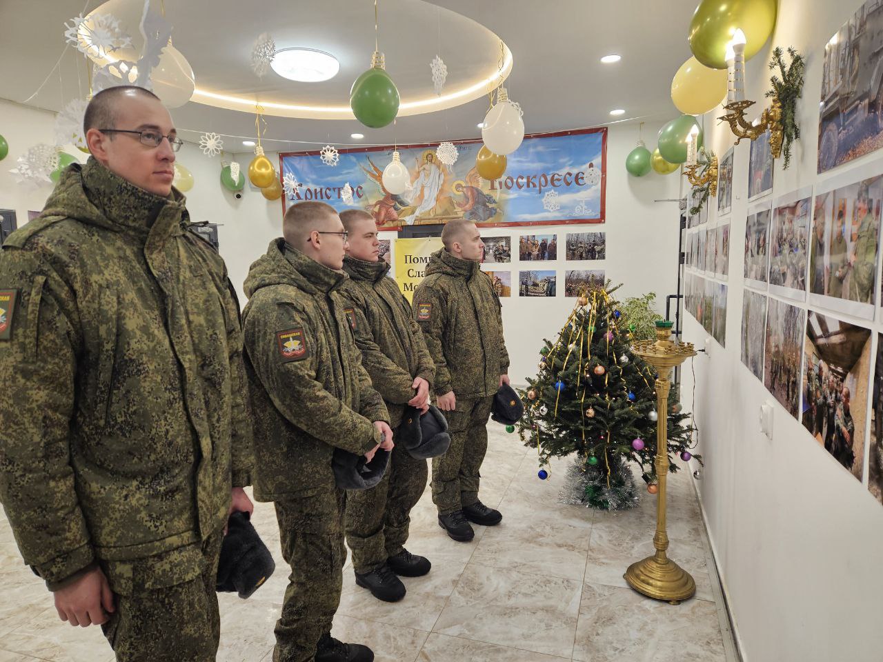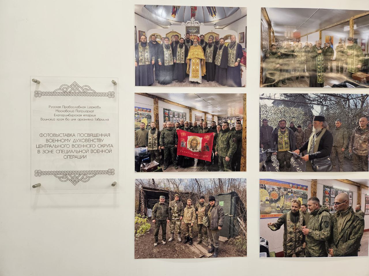 На первом этаже воинского храма в честь архангела Гавриила города Екатеринбурга размещена фотовыставка, посвященная служению священников Екатеринбургской епархии в зоне боевых действий.