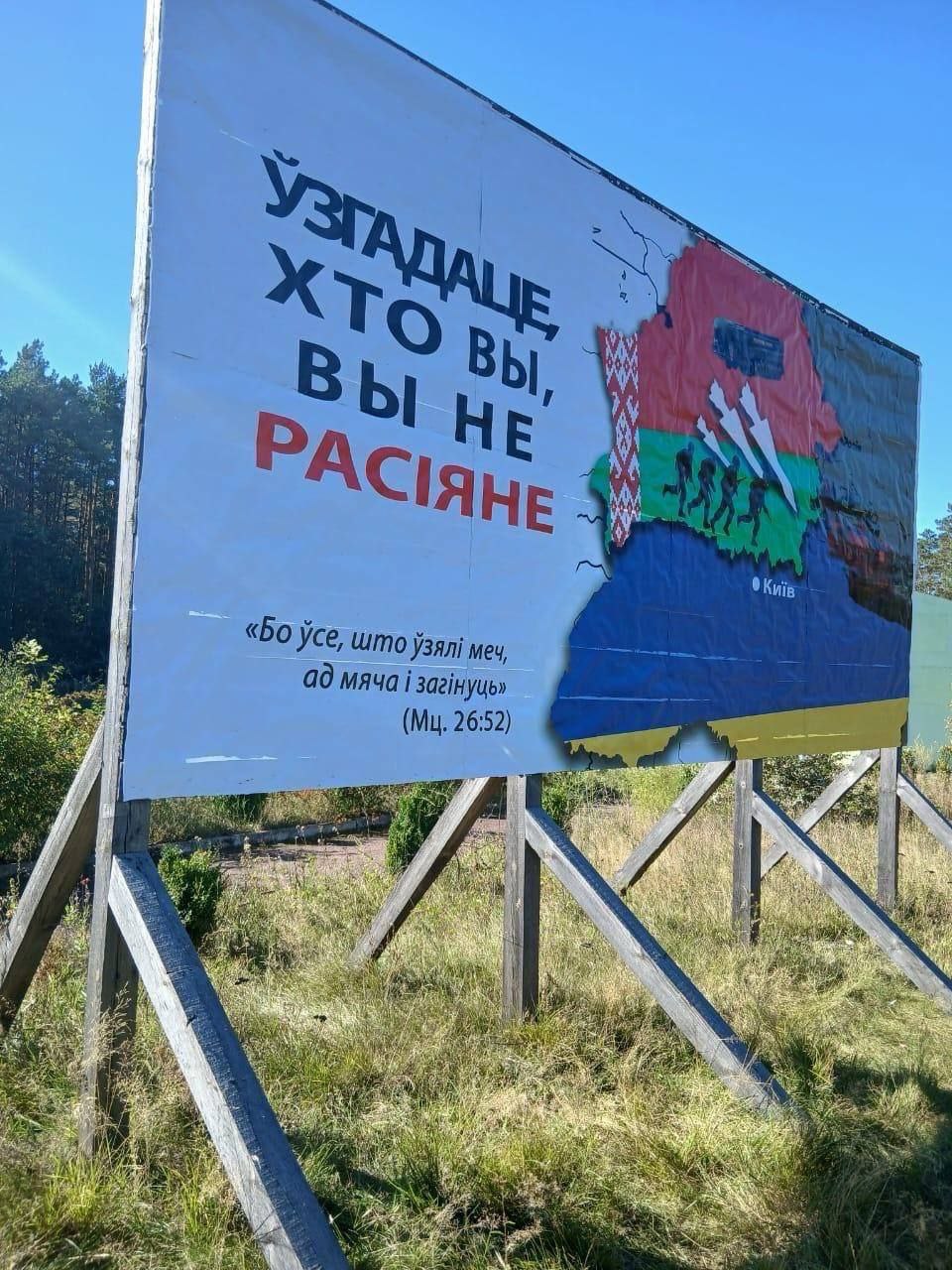 На границе Гомельской (Беларусь) и Житомирской (Украина) областей появились баннеры, призывающие белорусов «не сдавать свою страну за чужие интересы» и «вспоминать, что они не россияне».