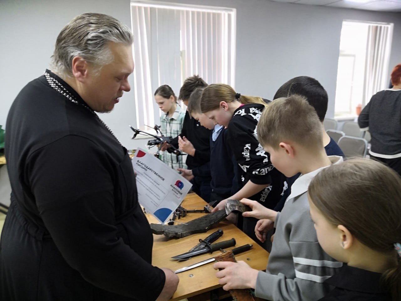 Особое внимание школьников привлекла, как утверждает пресс-служба епархии, коллекция воинских шевронов и боевых трофеев, которую священник привез с собой.