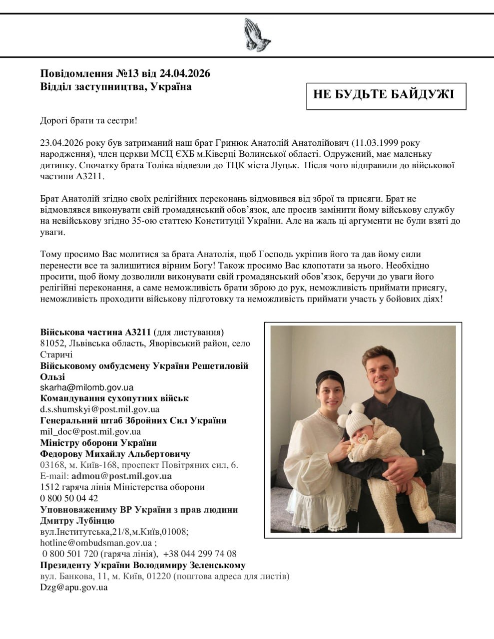 Ещё один случай — на Волыни: 23 апреля был задержанАнатолий Гринюк (1999 г.р.), член церкви МСЦ ЕХБ из Киверцов (Волынская область). Его сначала доставили в ТЦК Луцка, затем, как говорится в сообщении, отправили в воинскую часть А3211. Указывается, что он женат и имеет маленького ребёнка.