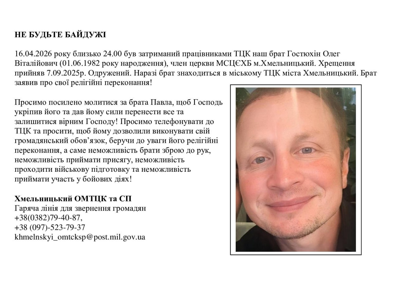 По сообщениям МСЦ ЕХБ, в Украине зафиксированы новые случаи задержаний верующих. В Хмельницком 16 апреля около полуночи сотрудники ТЦК задержалиОлега Гостюхина (1982 г.р.), члена церкви МСЦ ЕХБ; сообщается, что он находится в городском ТЦК и заявил о своих религиозных убеждениях.