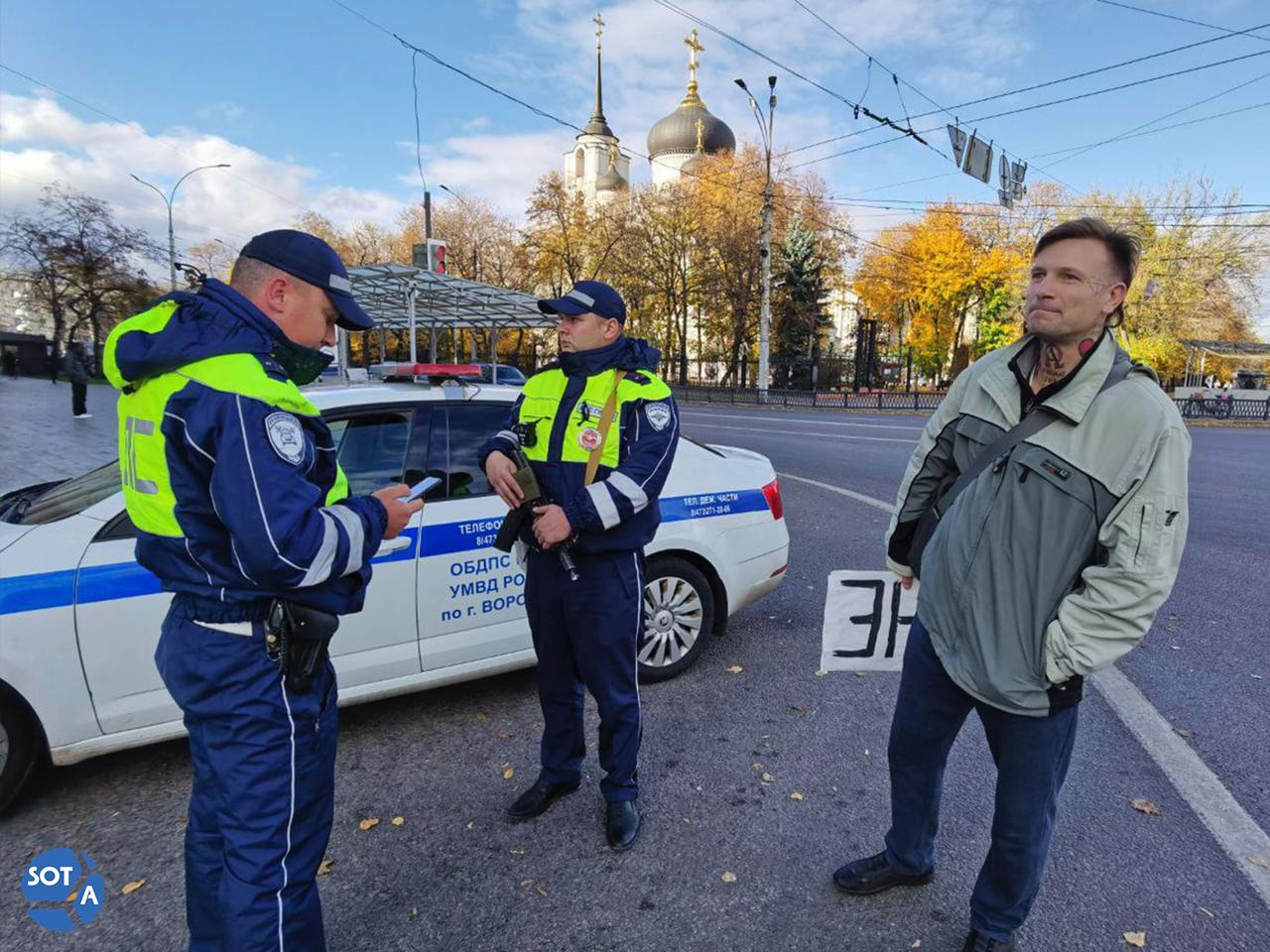 Акция прошла на одной из улиц Воронежа: Христолюб держал плакат с христианским посланием о мире, проезжающие водители сигналили ему в поддержку. Сперва за ним наблюдали сотрудники полиции на мотоциклах, но вскоре блогера задержали и доставили в Отдел полиции № 6.