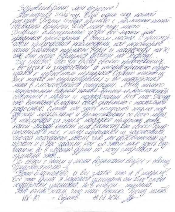 Вы знаете, что за время своего пребывания в узах и заключении я неоднократно обращался к церковным иерархам. Однако никто из них никак не отреагировал и не поддержал меня в этой ситуации. Только митрополит Ефрем нашел время и возможность связаться с мамой и поддержать всех нас. Тогда это внимание владыки было соразмерно с пасхальной радостью. Слыша, как здесь мусульмане и протестанты получают письма поддержки со всего мира, я, наблюдая за этим, надеялся получить хотя бы какой-то ответ или известие от своего Предстоятеля и тех, к кому обращался из заключения. Иногда появляется мнение, что мы действительно никому не нужны и о нас забыли, как нам это здесь внушают. Но в глубине души я не могу с этим смириться и принять это…