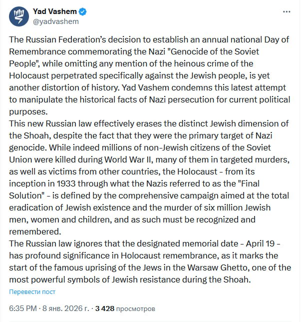 Израильский мемориальный центр Холокоста Yad Vashem раскритиковал решение РФ учредить ежегодный «День памяти жертв геноцида советского народа», где при этом не говорится о Холокосте как о целенаправленном уничтожении евреев. В Yad Vashem назвали это искажением истории и попыткой подогнать факты под текущую политику.